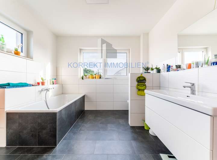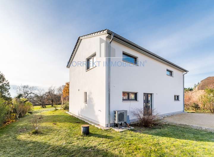 Die Ausstattung dieser Immobilie überzeugt durch eine hochwertige und moderne Gestaltung, die Komfort und Langlebigkeit perfekt vereint. Das Objekt wurde in Massivbauweise nach aktuellem Energiestandard errichtet und beeindruckt mit einem Satteldach inklusive Ziegeldeckung. Eine weiße Putzfassade und anthrazitfarbene Fenster verleihen dem Haus eine elegante Optik.