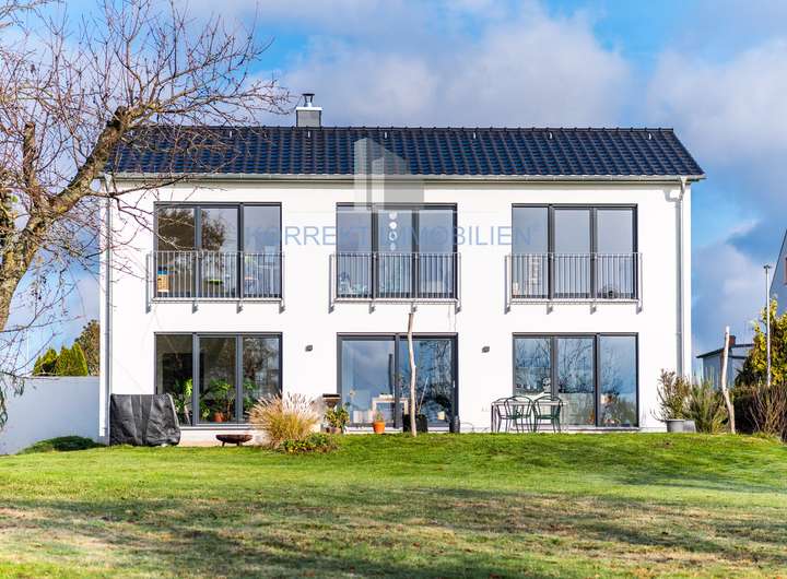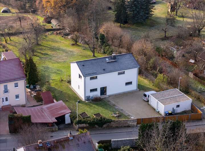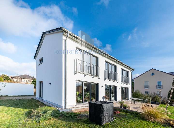 Entdecken Sie den Inbegriff exklusiven Wohnens: Zum Verkauf steht ein luxuriöses Einfamilienhaus in der begehrten Lage von Radebeul, das erst 2021 von der renommierten Hausbaufirma Helma errichtet wurde. Dieses Anwesen, gegründet auf einer stabilen Stahlbetonbodenplatte mit Frostschürzen, präsentiert sich in einem neuwertigen und makellosen Zustand.