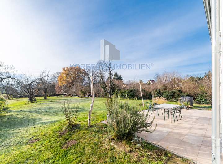 Der Terrassenbereich ist mehr als großzügig und mit einem Natursteinbelag versehen, begleitet von einem praktischen Sonnenschutz, was zu schönen Stunden im Freien einlädt. Ein Brunnen zur Gartenbewässerung (computergesteuert) und eine freistehende Doppelgarage, ergänzt durch weitere Außenstellplätze, runden das Angebot ab.
