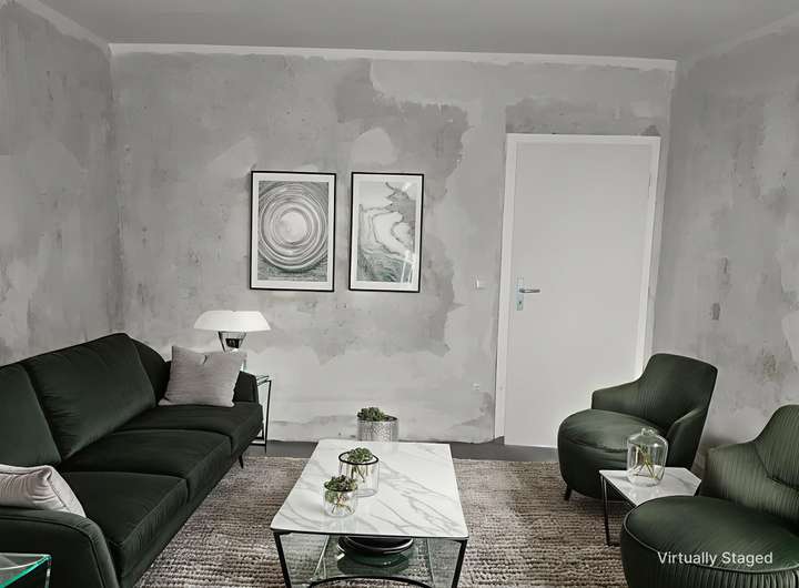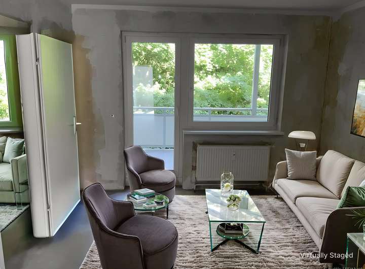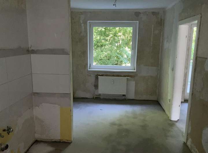 Die Decken werden tapeziert und weiß gestrichen. Die Wohnung ist unrenoviert, ohne Bodenbeläge und ohne Wandtapeten. Zur Eigenrenovierung bieten wir Ihnen einen digitalen Gutschein in Höhe von 500,00EUR an. Die Fotos sind aus der Wohnung, teilweise mit KI generiert.