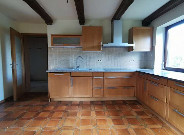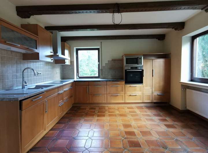 Massivbauweise, Pellet-Zentralheizung (Bj. ca. 2021), Holzfenster m. Isolierverglasung u. Rollladen, Holzinnentüren, Parkett-, Fliesen-, und Teppichböden, Einbauküche