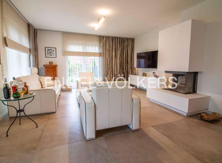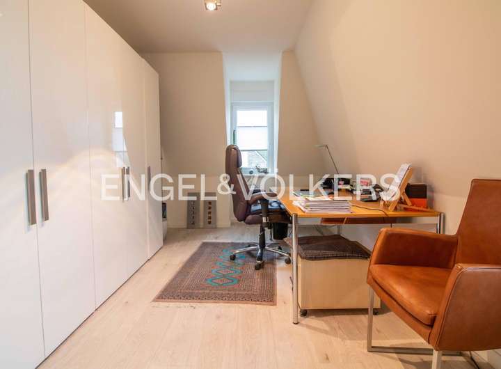 Das Erdgeschoss umfasst insgesamt zwei Zimmer, darunter einen offenen und großzügigen Wohn- und Essbereich mit Kamin, der dank bodentiefer Fenster und einem durchdachten Grundriss viel Licht und ein luftiges Wohngefühl vermittelt. Der Wohnbereich bietet zudem direkten Zugang zum Garten. Eine ansprechende offene Küche, ein helles Büro/Gästezimmer, ein Gäste-WC mit eigener Dusche und der Hauswirtschaftsraum vervollständigen die Ebene.