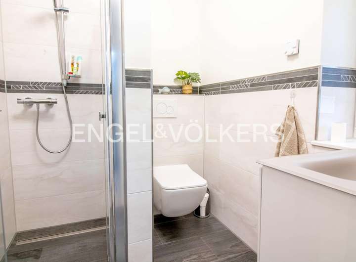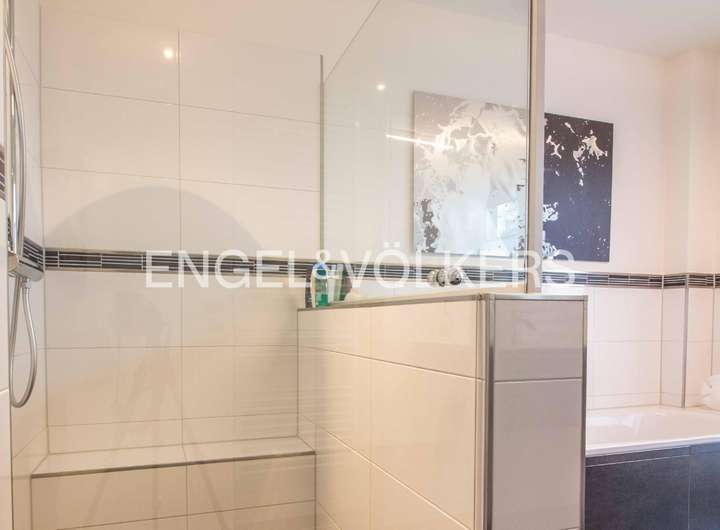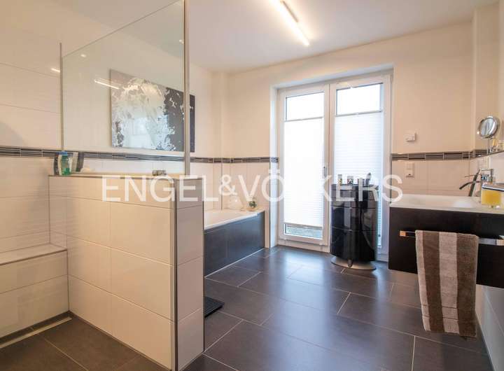 Ein stilvolles Vollbad mit Badewanne, großer bodentiefer Dusche und ein kleiner Balkon sorgen für zusätzlichen Komfort.