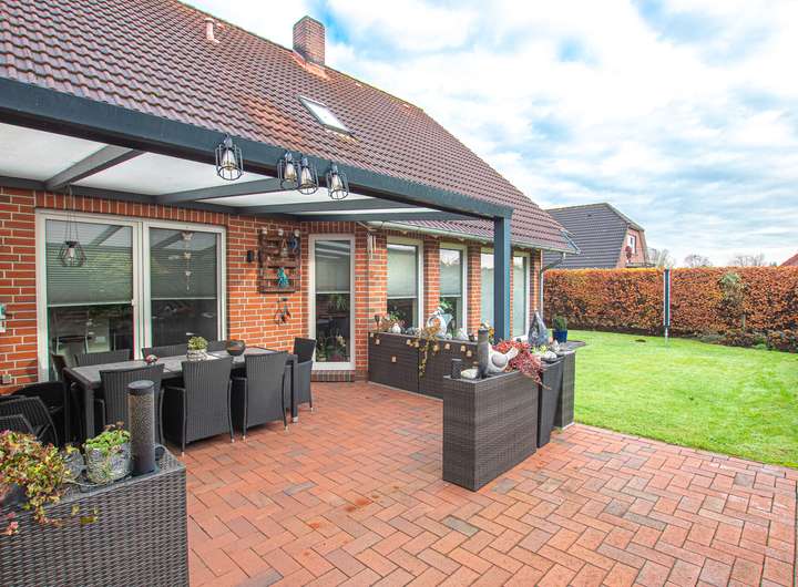 Der Außenbereich überzeugt mit einem gepflegten Garten, einer überdachten Terrasse sowie einem Carport und einer massiven Garage mit zwei Zugängen, davon einer direkt in den Garten.