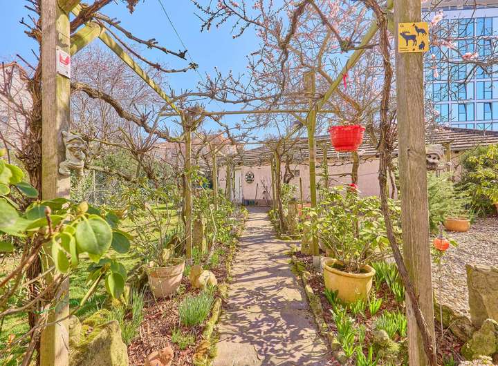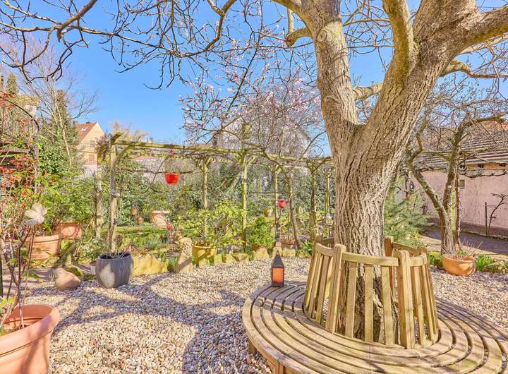 ✓ ein traumhaft gestalteter Garten mit altem Baumbestand, von Wildreben gesäumten Wegen und blühenden Mandelbäumen lädt zum Entspannen ein und führt zum Zugang der drei Garagen