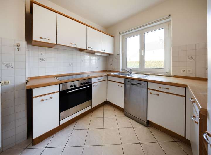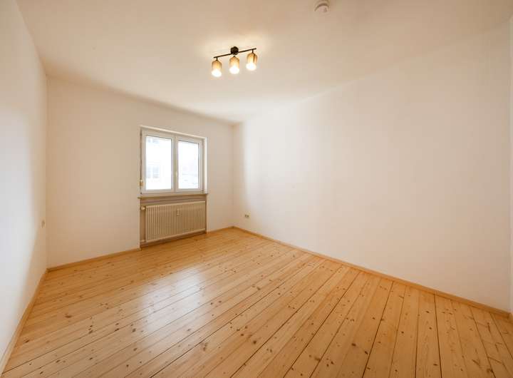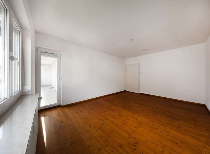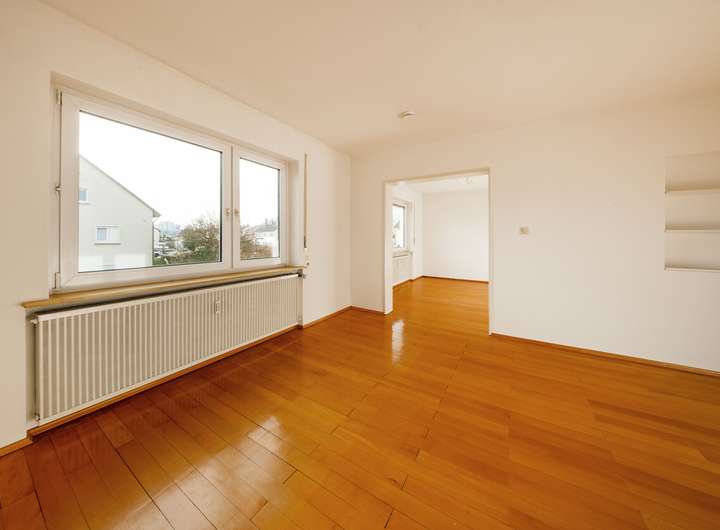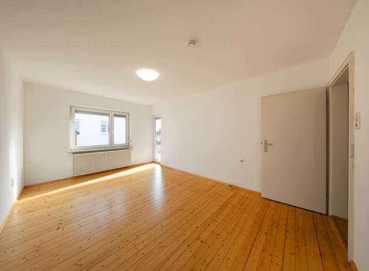 Die Erdgeschosswohnung verfügt über vier Zimmer, darunter zwei komfortable Schlafzimmer, ein Wohnzimmer, ein Esszimmer, eine separate Küche, Tageslichtbad sowie ein separates WC. Vom Balkon aus gelangt man über eine Treppe direkt in den Garten.