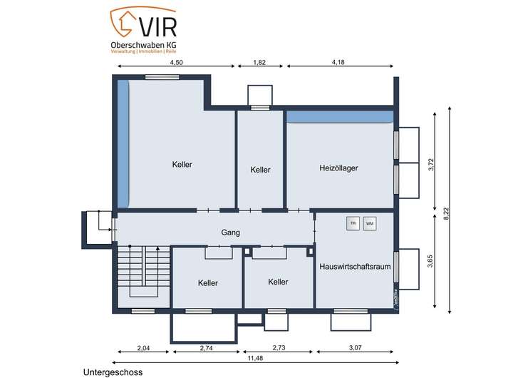 Im Untergeschoss befindet sich der vollunterkellerte Bereich mit Waschkeller, Heizungsraum, Öllagerraum und drei weiteren Kellerräumen. Von hier aus gibt es zudem einen Außenzugang zur Garage und in Richtung Garten.