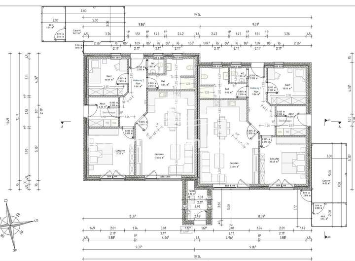 EG: Flur/Diele, Gäste WC, Duschbad mit WC, Gästezimmer, HWR, offener Wohn-/Essbereich mit Küchenanschlüssen und Zugang zur Terrasse, Abstellraum, Schlafzimmer