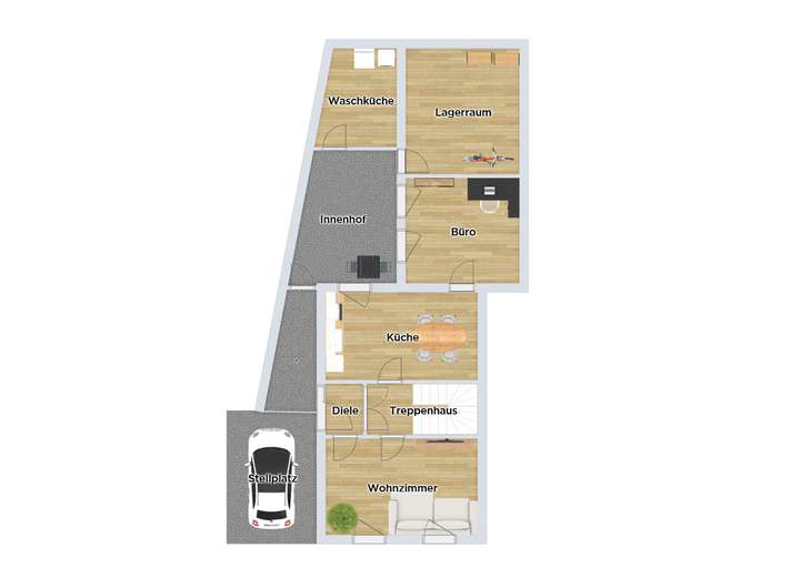 Das Erdgeschoss beherbergt neben Küche, Wohnzimmer und Gäste-/Arbeitszimmer zudem einen Lagerraum nebst großzügiger Waschküche.