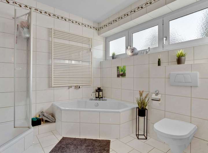 Die durchdachte Architektur überzeugt mit einem zentralen Treppenhaus, das beide Wohneinheiten separat zugänglich macht. Mit einer Wohnfläche von insgesamt 245,97m² erstreckt sich das Haus über zwei großzügige Etagen: Das Erdgeschoss bietet 122,16m² mit 5 Zimmern und einer sonnigen Süd-West-Terrasse mit 15m², während das Obergeschoss mit 123,81m² ebenfalls 5 Zimmer sowie einen 11m² großen Balkon und eine Loggia umfasst. Das ausbaufähige Dachgeschoss bietet zudem Potenzial für eine weitere Wohneinheit von ca. 100m². Das voll unterkellerte Gebäude bietet neben zusätzlichem Stauraum eine eigene Wellnessoase mit Sauna und Dusche sowie eine rustikale Bar. Das 930m² große, eingezäunte Eckgrundstück ist liebevoll angelegt und bietet eine große Rasenfläche mit attraktiven Anpflanzungen. Eine Doppelgarage mit elektrischen Sektionaltoren sowie drei zusätzliche Stellplätze sorgen für höchsten Komfort.
