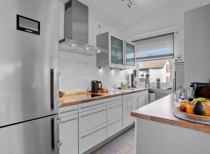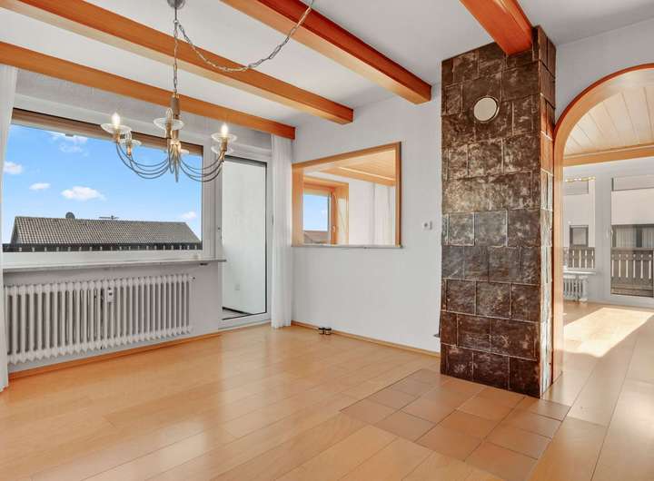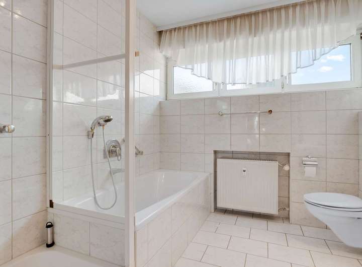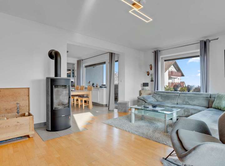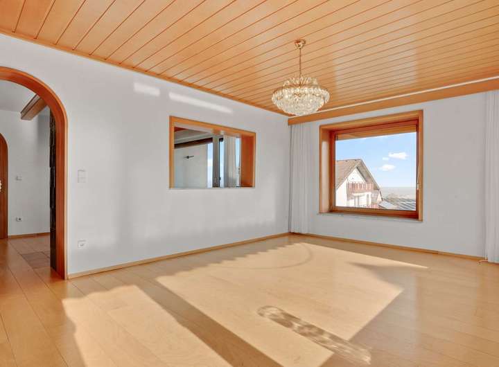 Im Obergeschoss stehen ebenfalls fünf Zimmer zur Verfügung, darunter ein 24 m² großer Wohnbereich mit Echtholzboden und Zugang zum 11m² großen Balkon sowie ein Essbereich mit 16m² und Kaminanschluss. Die geräumige Küche mit 8m² kann wie im Erdgeschoss zu einem offenen Koch- und Essbereich umgestaltet werden. Drei Schlafzimmer bieten mit 12m², 17m² und einem 19m² großen Elternschlafzimmer samt Balkonzugang reichlich Platz. Das stilvoll renovierte Badezimmer von 2009 ist mit Dusche, Badewanne und WC ausgestattet. Auch hier sorgen Echtholzböden für ein warmes Wohngefühl.