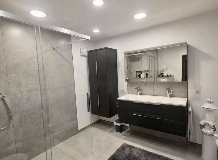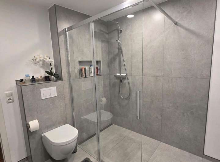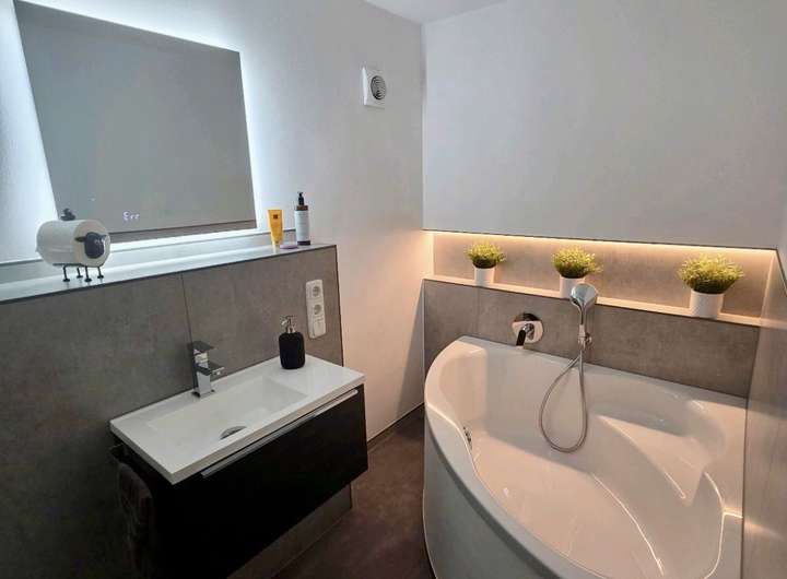 Drei moderne Bäder (1× Badewanne, 2× Dusche)