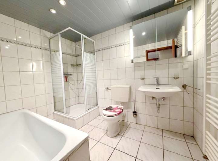 Rechts befindet sich eines der Schlafzimmer. Weiter entlang des Flurs erreicht man die Wohnküche sowie das innenliegende Badezimmer, das dank seiner Größe sowohl eine Dusche als auch eine Badewanne beherbergt.