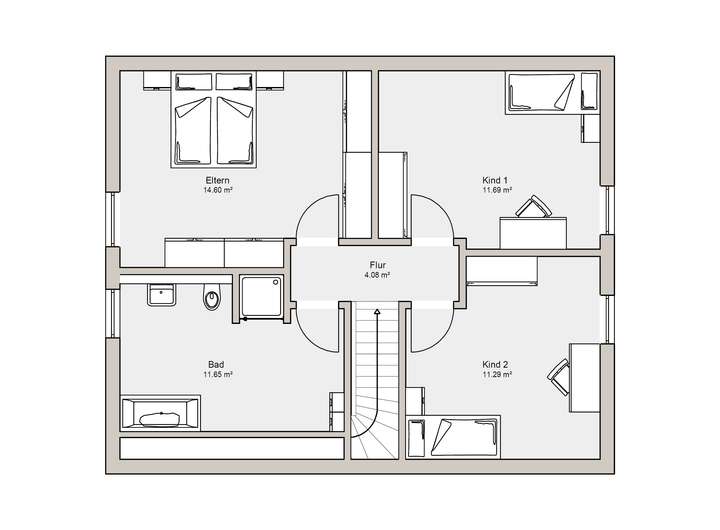 Im Dachgeschoss des Satteldachhauses befinden sich zwei Kinderzimmer, ein Elternschlafzimmer und das geräumige Familienbad.