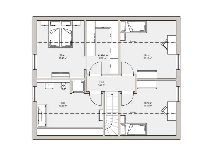 Abgerundet wird das Satteldachhaus im Dachgeschoss mit einem Elternschlafzimmer mit einer Ankleide, zwei Kinderzimmer und einem geräumigen Familienbad.