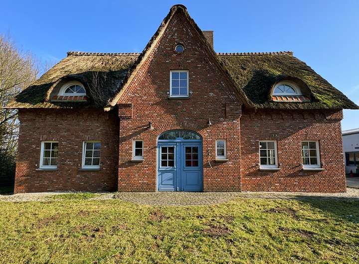 Erdgeschoss: Offener Wohn-, Ess- und Küchenbereich (mit wassergeführtem Holzkamin), Gästezimmer (respektive Büro), Diele, Bad (mit ebenerdiger Dusche, Waschtisch, WC und Pissoir)