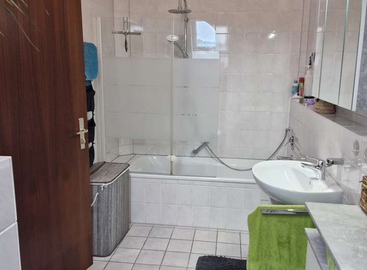 In den Wohnräumen ist Laminat verlegt und Fliesen in Küche, Bädern und Flur.