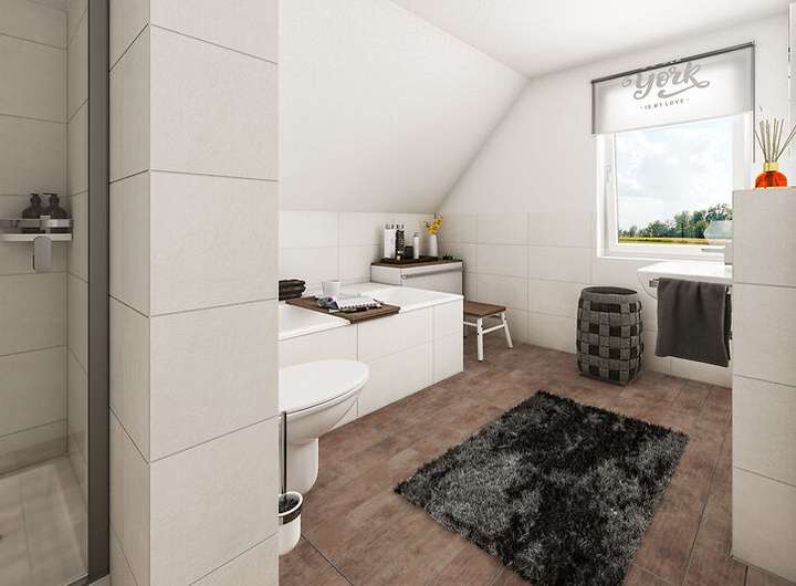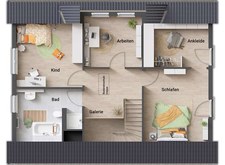 Ins Dachgeschoss gelangen Sie über ein nach oben offen gehaltenes Treppenhaus. Zum geräumigen Schlafzimmer gehört eine Ankleide, die für Ordnung sorgt. Die beiden anderen Räume können Sie als Kinder-, Gäste- oder Arbeitszimmer nutzen.