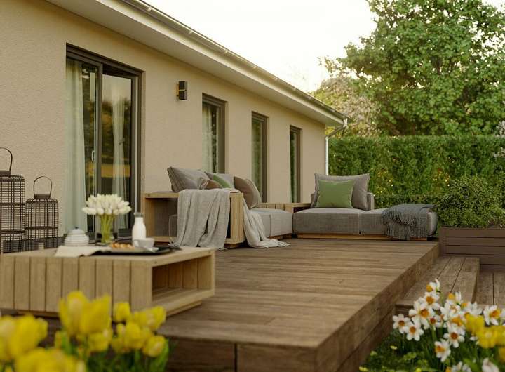 Familienleben auf einer Ebene - Der Bungalow 131 hat es in sich – 5 Zimmer, zwei Kinderzimmer und zwei Bäder – viel Wohnfläche und clever nutzbarer Stauraum für die ganze Familie. Die kluge Raumaufteilung bietet eine große Wohnküche in der Sie mit ihren Lieben Freizeit und Essen genießen können. Das traumhafte Wohnzimmer mit seinen großen Fenstern ist der perfekte Ort zum Entspannen, bietet freien Blick in Ihren Garten und mit wenigen Schritten sind Sie auf Ihrer Terrasse im Grünen.