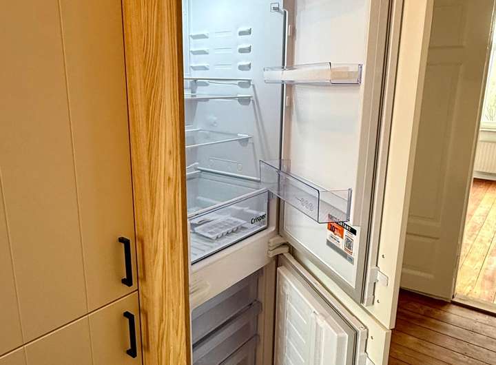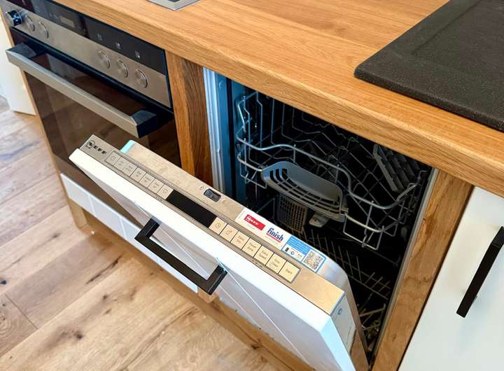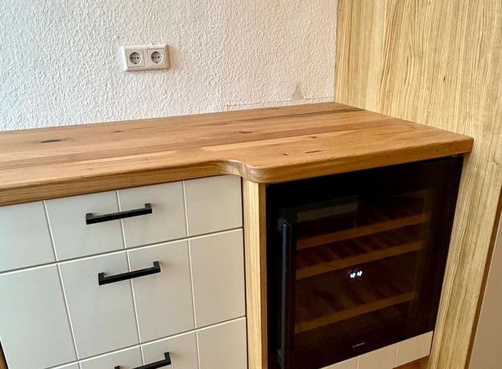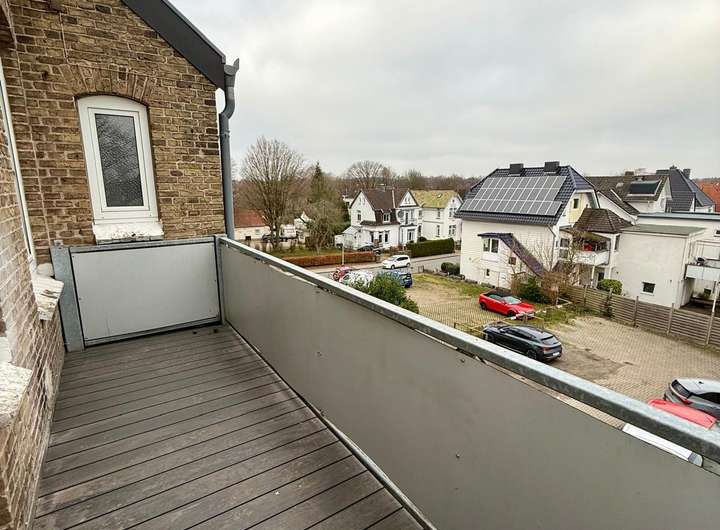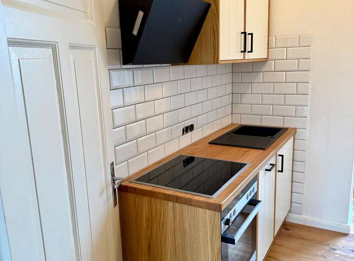 Ein besonderes Highlight ist die neue, vom Tischler maßgefertigte Einbauküche aus teilmassiver Eiche. Sie ist mit hochwertigen Siemens-Elektrogeräten, Spülmaschine, Einbaukühlschrank sowie einem integrierten Weinkühler ausgestattet und erfüllt höchste Ansprüche an Design und Funktionalität. Der sanierte Balkon bietet eine schöne Aussicht über die Dächer Schleswigs und lädt zum Entspannen ein.