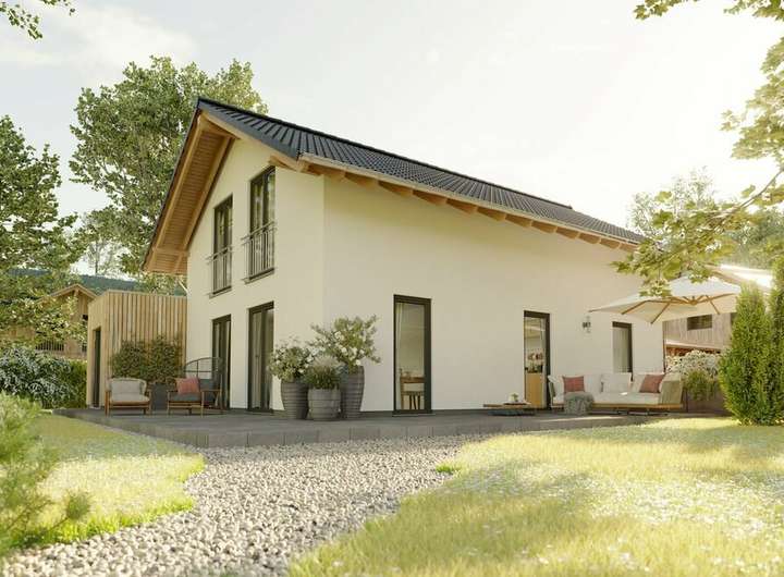 Das großzügige Haus mit dem schönen Satteldach überzeugt mit viel Platz und einem variablen Grundriss. Das Wohnzimmer schenkt genügend Raum zur Erholung, die sich anfügende Essecke wird schnell zum gemütlichen Familienmittelpunkt mit direktem Zugang zur Küche. Die hohen Fenster fangen das Tageslicht besonders gut ein. Jeder Raum im Haus wirkt offen und freundlich. Ein Arbeits- oder Kinderzimmer und das Gäste-WC runden das Erdgeschoss perfekt ab.