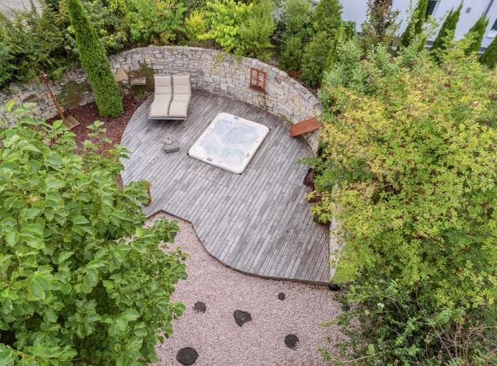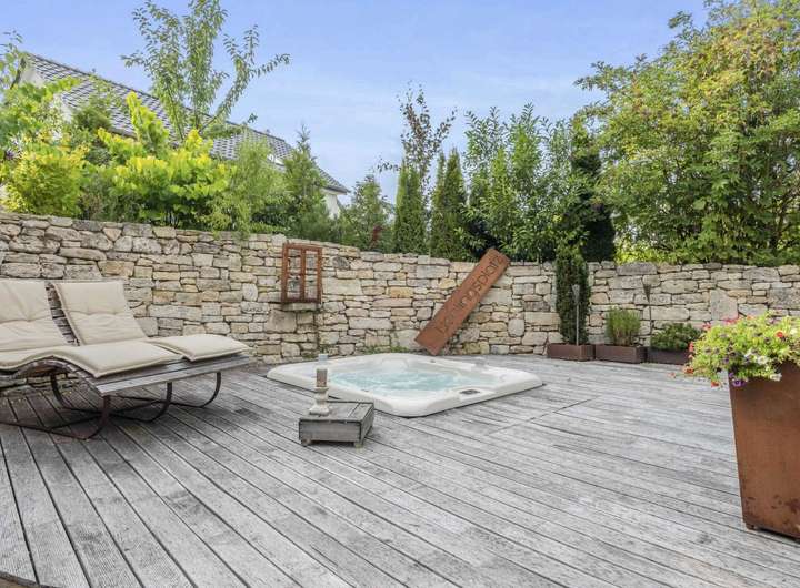 Besonders der idyllische Außenbereich des ca. 973 m² großen Grundstücks trägt zum vollendeten Wohngenuss der herrlichen Immobilie bei: Hier finden Sie den optimalen Ort für die absolute Entspannung im Jacuzzi oder in der Sauna, für gemeinsame Momente mit Freunden und Familie auf der überdachten Terrasse oder für entschleunigte Stunden in Ihrem Nutzgarten. Abgerundet wird das vielfältige Angebot durch 3 inkludierte Stellplätze für Ihre Pkw.