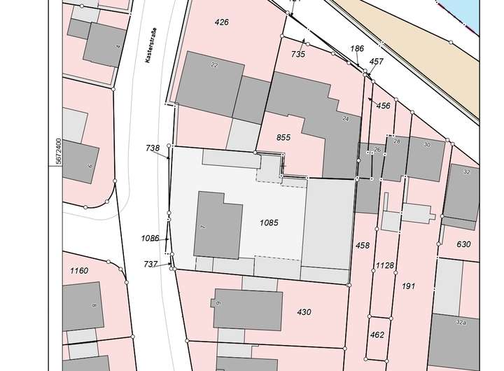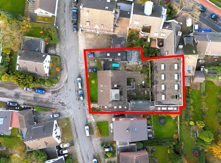 Das großzügige Areal ist derzeit mit einem Dreifamilienhaus, einer verlängerten Garage sowie einem entkernten Rohbau einer ehemals gewerblich genutzten Immobilie bebaut. Diese Bestandsgebäude müssten bei einer Neubebauung abgerissen werden.