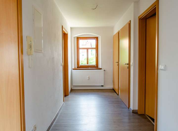 Die Wohnfläche von ca. 120 m² verteilt sich auf das Erdgeschoss und auf das 1. Obergeschoss. Ein weitläufiger Flur erschließt den ehemaligen Gemeinderaum, der mit einer stattlichen Größe von ca. 35 m² die Möglichkeit bietet, durch eine Teilung 2 attraktive Zimmer zu erhalten. Auf der gegenüberliegenden Seite des Flurs finden wir 2 WC`s und eine Teeküche vor. Auch hier eröffnet sich einem Käufer die Option, die Teeküche durch das Herausnehmen einer Wand mit einer der Toiletten zusammenzulegen und zu einem charmanten Bad umzubauen.