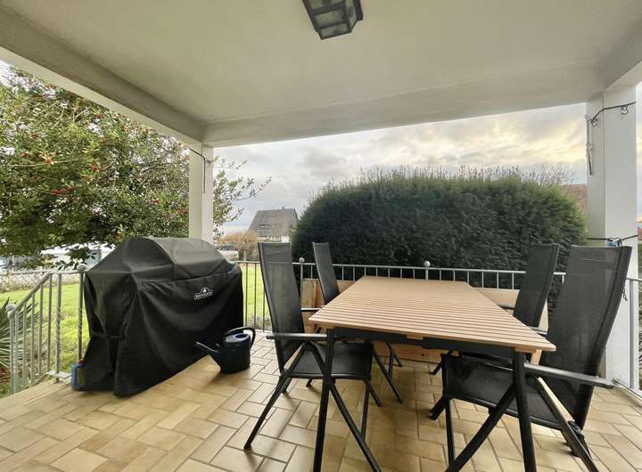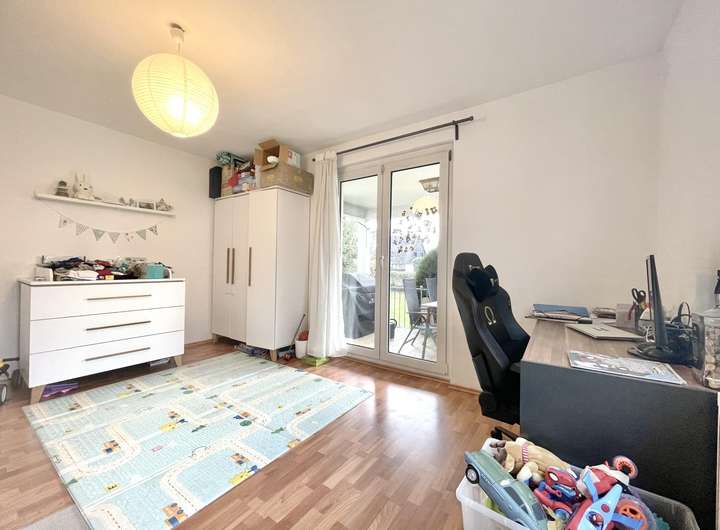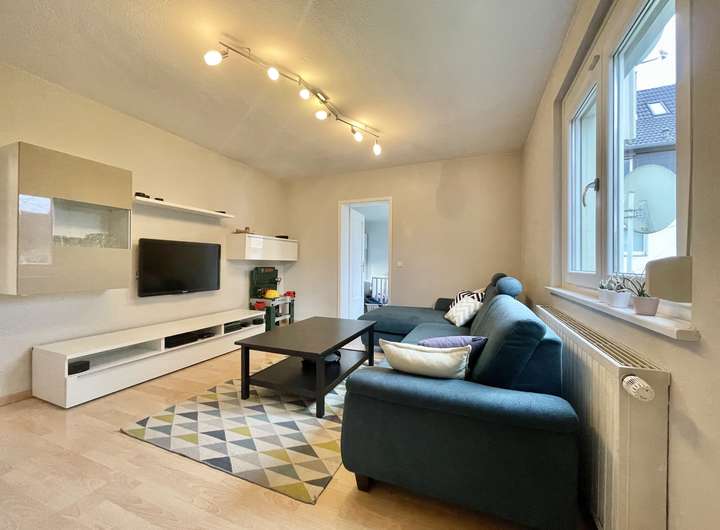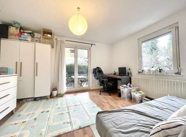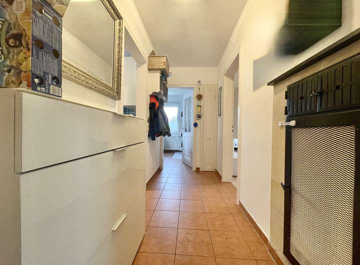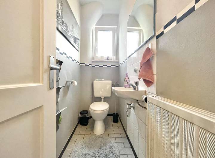Ins charmante Haus gelangen Sie über einen kleinen Treppenaufgang und betreten über das Treppenhaus die Erdgeschosswohnung mit 3 Zimmern, einer Küche, einem Badezimmer und einem Gäste-WC. Die ca. 83 m² helle und klar gegliederte EG-Wohnung ist durch einen zentralen Flurbereich erschlossen. Sie erreichen von hier sowohl das Wohn- und Esszimmer als auch das 2. Zimmer, die Küche, das Badezimmer und das Gäste-WC. Lediglich das 3. Zimmer, welches momentan als Schlafzimmer genutzt wird, ist über das Wohnzimmer zu erreichen. Aus der Wohnung gelangen Sie über eine überdachte Terrasse in den großzügigen Garten oder aus dem dritten Zimmer auf einen tollen Balkon.