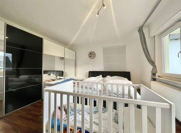 Die Wohnung im Obergeschoss ist identisch geschnitten, bietet aber durch zwei weitere zu Wohnzwecken ausgebaute Räume im Dachgeschoss erweiterte Nutzungsmöglichkeiten.