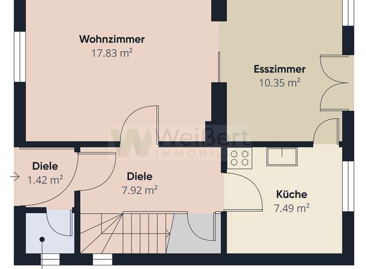 Bereits beim Betreten des Hauses empfängt Sie ein kleiner Eingangsbereich bzw. Windfang, von dem aus Sie unmittelbar das Gäste-WC erreichen. Geradeaus gelangen Sie in die zentrale Diele, von hier aus erschließen sich alle Räume dieser Ebene sowie die Holztreppe, die in das Dachgeschoss führt.