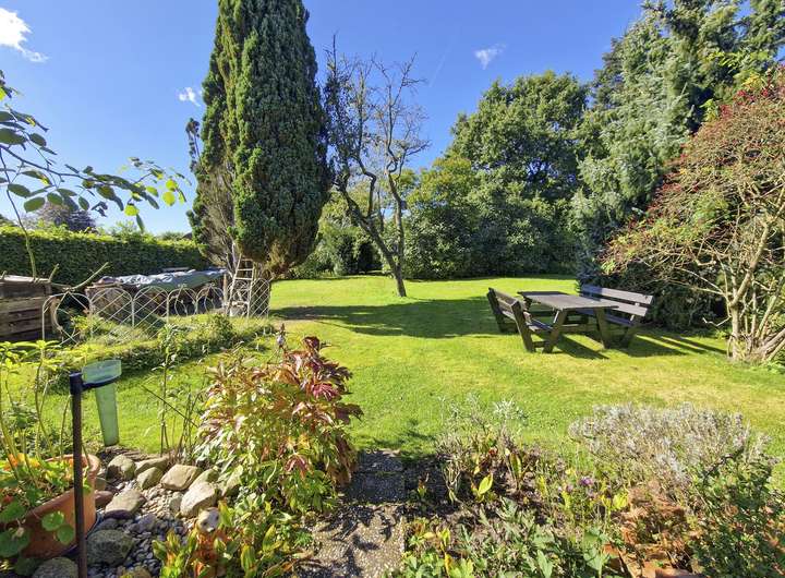 Das Grundstück selbst ist ein echtes Highlight: Ein großer, eingewachsener Garten mit altem Baumbestand bietet viel Privatsphäre und lädt zum Entspannen ein. Die sonnige Südwestterrasse ist der perfekte Ort für gemütliche Stunden im Freien. Für Ihre Fahrzeuge stehen eine massive Einzelgarage sowie Platz auf der Auffahrt zur Verfügung.
