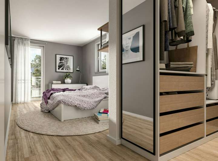 Auch im Obergeschoss wird moderner Wohnkomfort großgeschrieben. Während im geräumigen Wohnzimmer alle zusammenkommen, bieten drei weitere Zimmer einen individuellen Rückzugsort. Ausreichend Stauraum ist dank eines Abstellraums im Flur und einer Ankleide im Schlafzimmer gewährleistet.