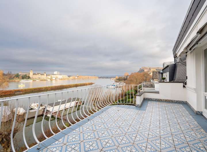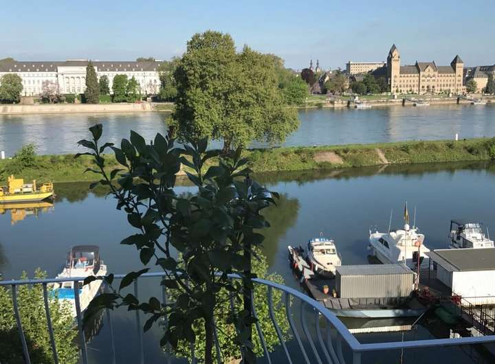 Der westlich ausgerichtete Balkon ermöglichst lange sonnige Abendstunden mit Ausblick auf die Wahrzeichen von Koblenz: Schloß Koblenz, Deutsches Eck, Rheinanlagen und die Festung Ehrenbereitsein - diese machen die Geschichte der Stadt in unmittelbarer Nähe erlebbar.