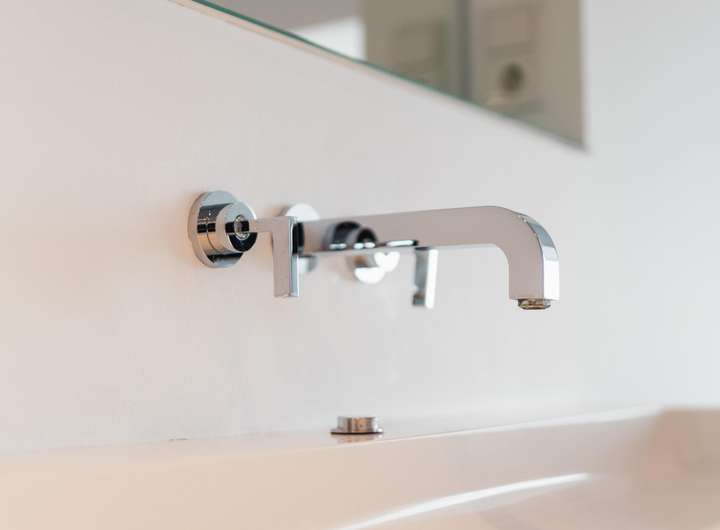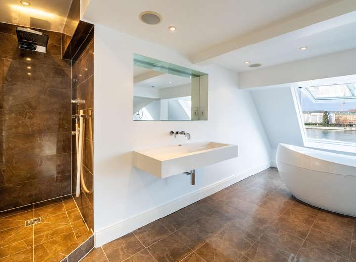 - modernes Bad mit freistehender Badewanne auf der oberen Ebene