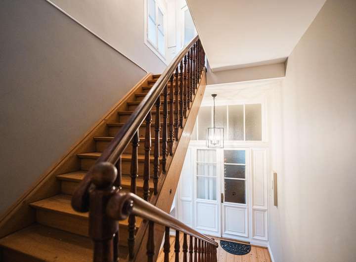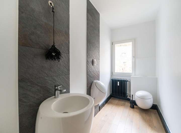 Über ein gemeinsames Treppenhaus mit alten Holzstufen und vielen erhaltenen Details erreicht man die Wohnung und wird vom imposanten Wohnbereich empfangen. Dieser ist offen gestaltet mit einer modernen Küche sowie Kaminofen und bildet das Zentrum dieser Einheit. Eine große faltbare Fensterfront öffnet sich dabei zum Balkon und erweitert den Wohnraum im Sommer gelungen. Unter der großen Markise klingt der Feierabend ideal aus oder bietet das passende Ambiente für einen schönen Abend mit Freunden.