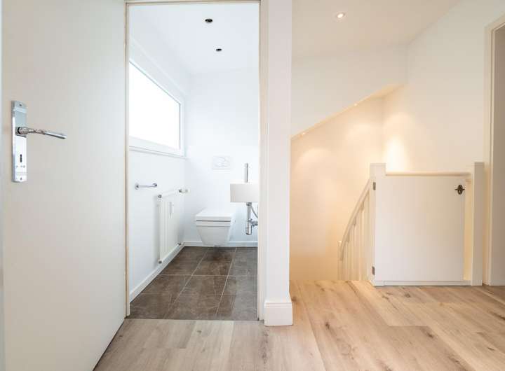 Auf dieser ersten Ebene liegen außerdem noch 2 Zimmer, die z. B. als Kinder-, Gästezimmer oder Büro genutzt werden können. Außerdem ein Bad mit Badewanne, ein modernes Gäste-WC sowie ein kleiner Hauswirtschaftsraum.