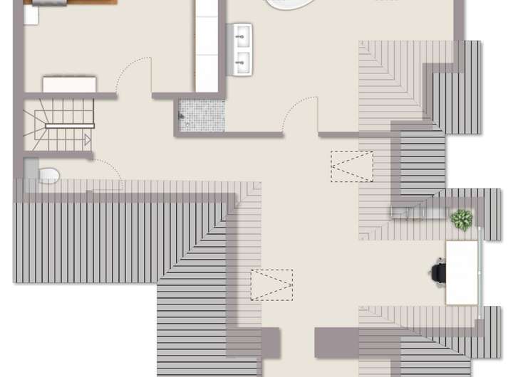Zusätzlich liegen unter den Dachschrägen weitere Bereiche, die nicht in der Wohnfläche mit enthalten sind, aber Potential für die individuelle Nutzung z.B. als Hobbyraum bieten.