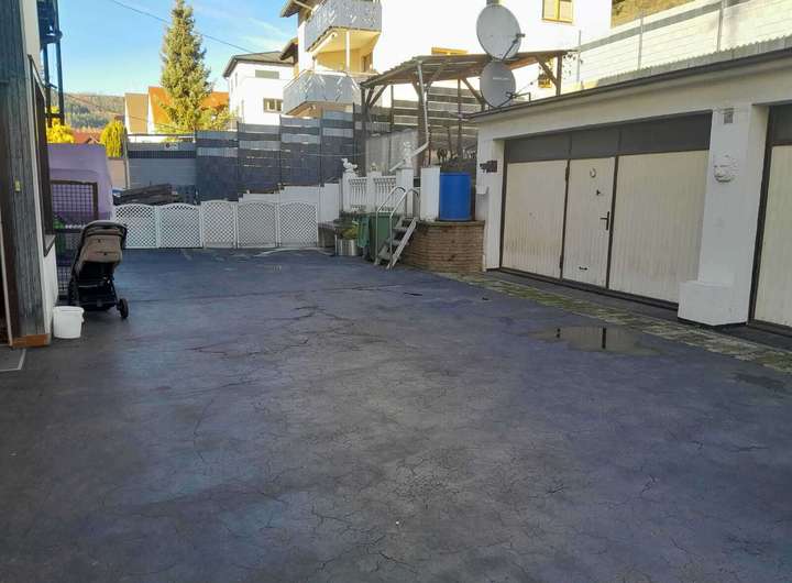 Über die Einfahrt rechts erreicht man den Innenhof mit einem weiteren Außen-Stellplatz und einer Einzelgarage.