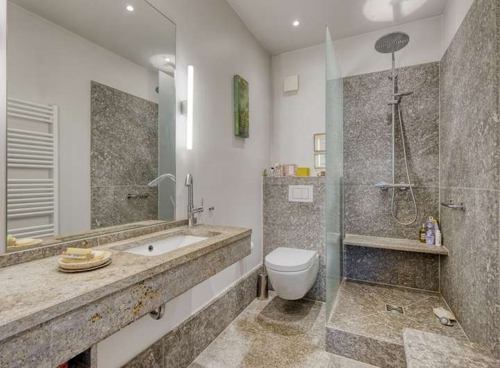 - Teilweise hochwertige Natursteinbäder