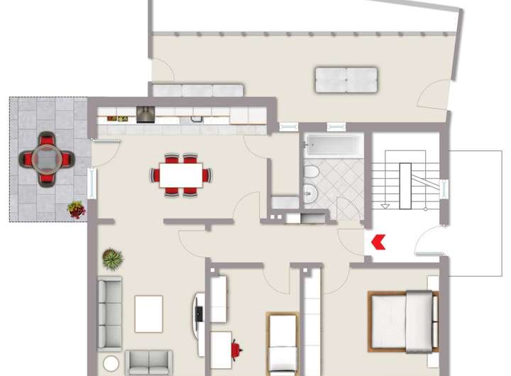 Ein eigenes Kellerabteil gehört zur Wohnung und bietet zusätzlichen Stauraum. Ein weiteres Merkmal ist die eigene Terrasse, die direkt vom Wohnbereich aus zugänglich ist und einen angenehmen Außenplatz schafft.