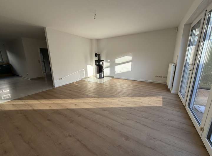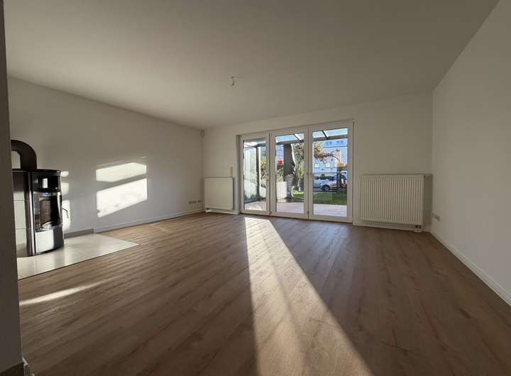 Im Erdgeschoss befinden sich ein Gästebad mit Waschmaschinenanschluss, eine hochwertige Einbauküche mit Side-by-Side-Kühlschrank sowie ausschließlich neuen Elektrogeräten. Der Wohn- und Essbereich verfügt über einen Kamin und bietet direkten Zugang zum Garten. Ergänzend steht ein Hauswirtschaftsraum zur Verfügung.