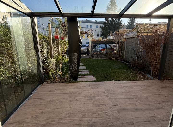 Die Terrasse ist mit einer Echtglasüberdachung inklusive Verschattung ausgestattet und verfügt über einen Außenwasseranschluss.