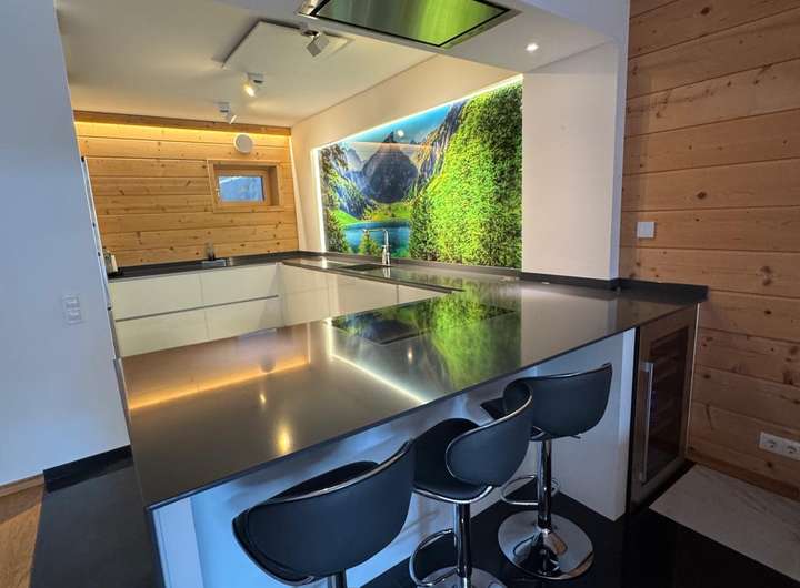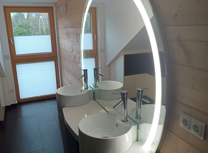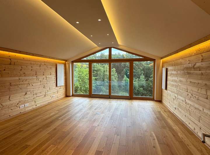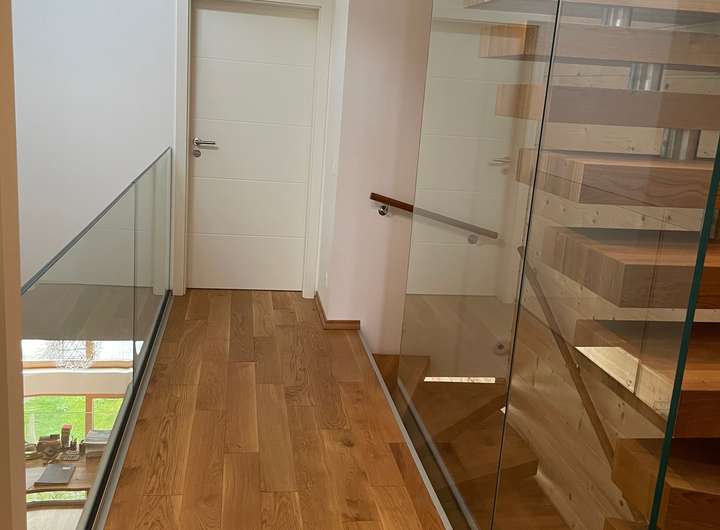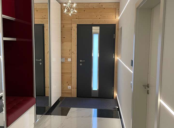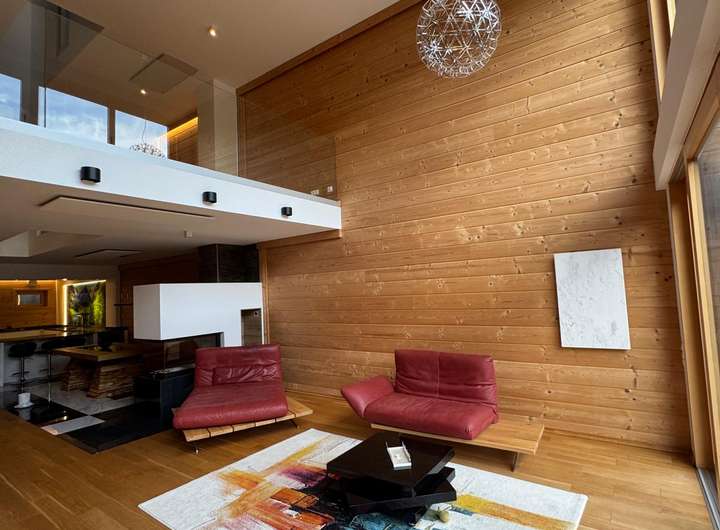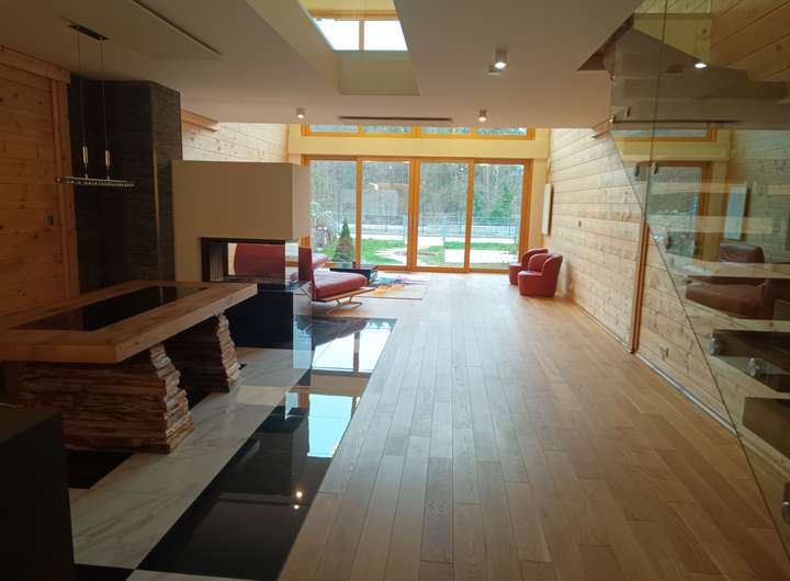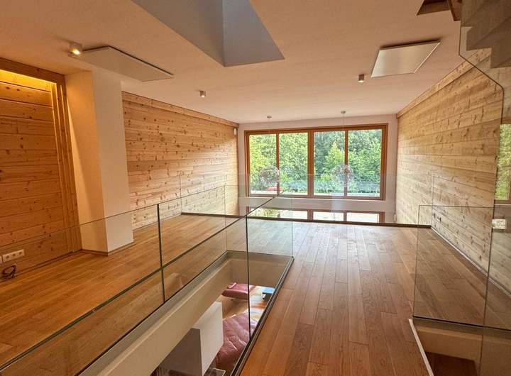 Das Haus überzeugt durch Architektur und energiesparenden, umweltfreundlichen Holzbau kombiniert mit einem speziellen Stahlbetonträgersystem. Es ist energieeffizient ausgebaut und erfüllt KfW 40 Anforderungen. Mit den mehrschichtig verleimtes Massivholz-Innenwände 8 cm , hohem Deckenniveau und ausreichend Tageslicht durch die bodentiefe Fenster und eine Öffnung über die 4 Ebene bietet das Haus viel Gemütlichkeit , einzigartige Atmosphäre und höchste Lebensqualität an.