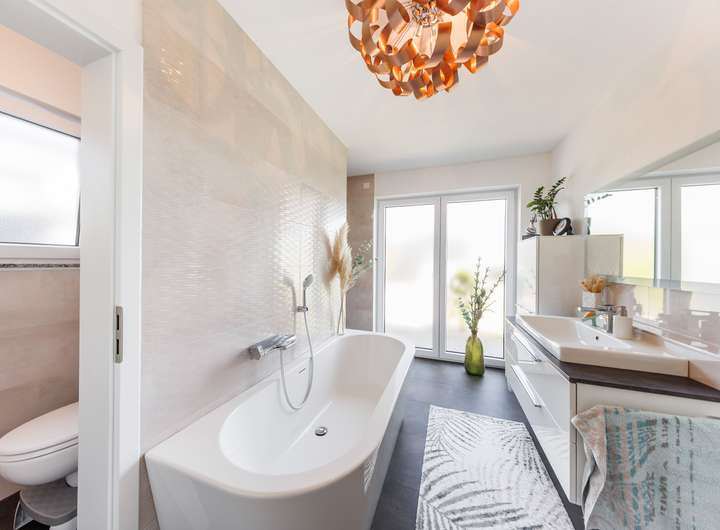 - Masterbad mit Wanne, Dusche, WC und Gartenzugang