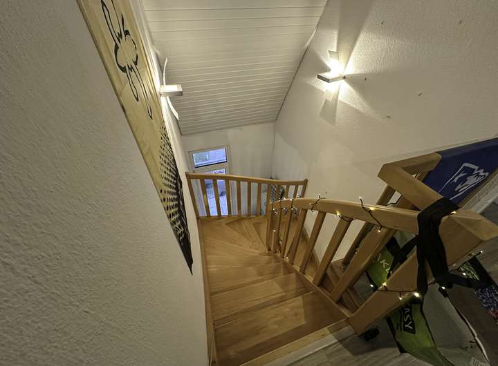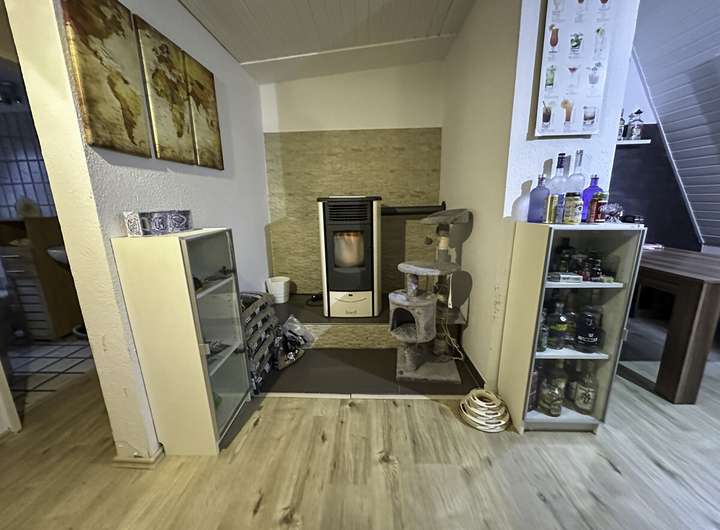 Der obere Bereich umfasst ein separates WC mit Waschmaschinenanschluss, einen hellen Essbereich sowie den angrenzenden Wohnbereich, der durch seine offene Gestaltung ein angenehmes Raumgefühl vermittelt. Ebenfalls auf dieser Ebene befindet sich die funktionale Küche, ausgestattet mit einer modernen Einbauküche. Ein zusätzlicher Pluspunkt ist der vorhandene Pellet-Ofen, der für eine gemütliche Atmosphäre sorgt und zugleich energieeffizientes Heizen ermöglicht. Darüber hinaus stehen den Bewohnern ein Fahrradschuppen und weitere Gemeinschaftsflächen zur Verfügung.