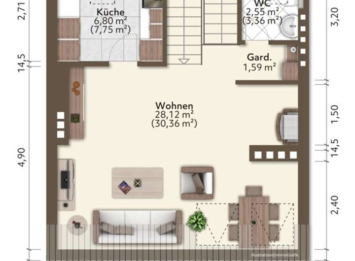 Oberer Bereich: WC mit WM-Anschluss, Essbereich, Wohnbereich mit Pellet-Kamin, Küche mit EBK