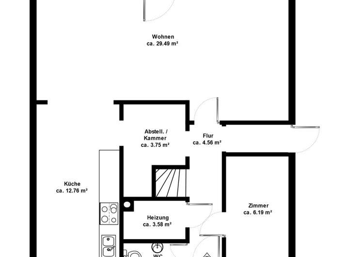 Auf ca. 96,79 m² verteilen sich der geräumiger Wohn- und Essbereich, die Küche, vier Zimmer, ein Wannenbad, ein Gäste-WC sowie zwei Abstellräume. Die ehemalige Garage wird heute als beheizbare Abstellfläche genutzt und rundet das Platzangebot ideal ab.