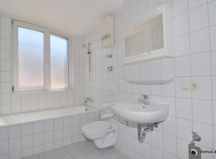 Das Bad mit Fenster ist raumhoch im weißen Fliesenformat verfliest und verfügt über eine Badewanne & Platz für eine Waschmaschine.