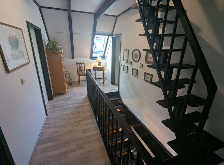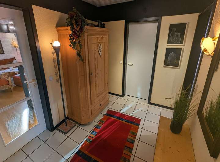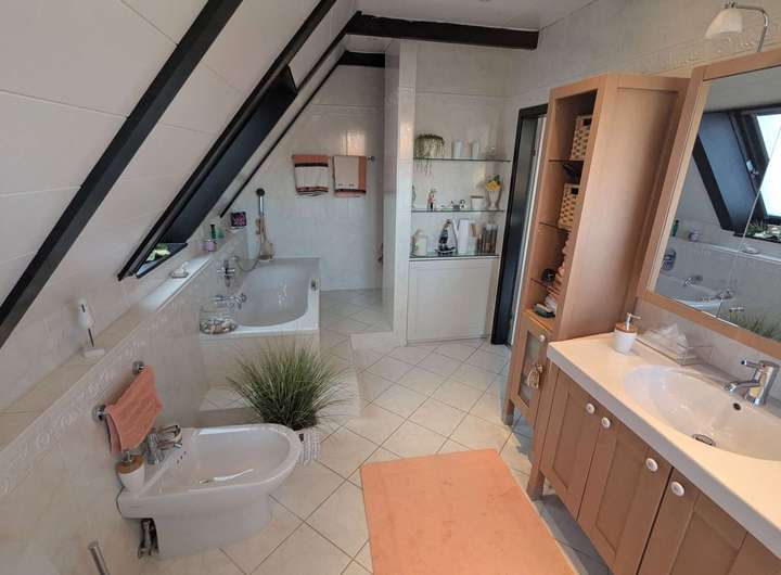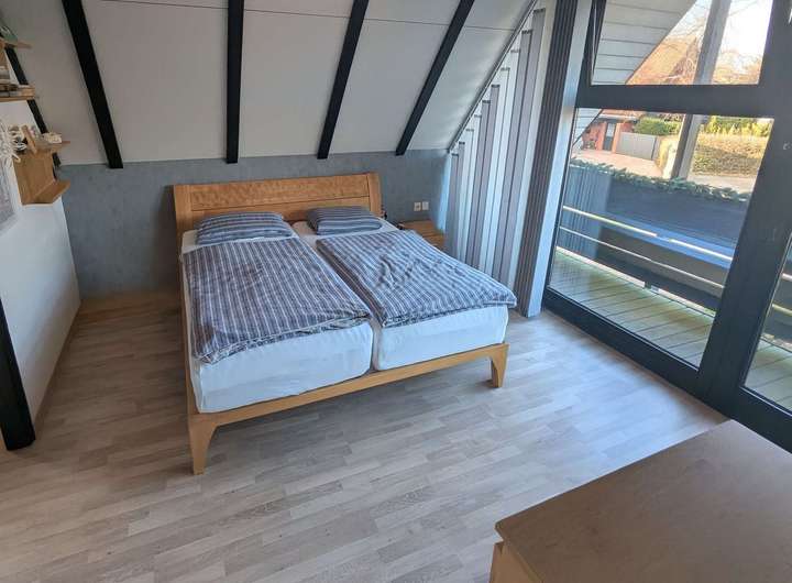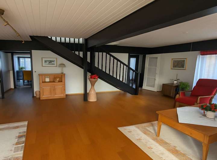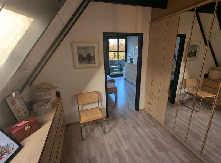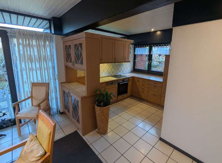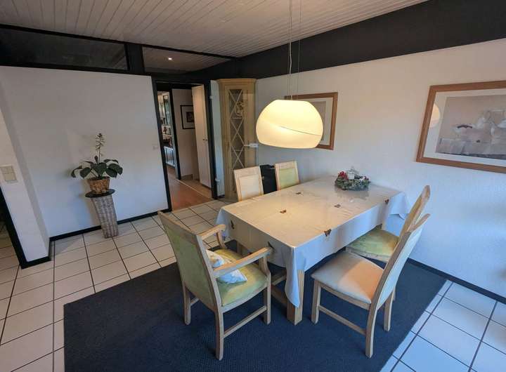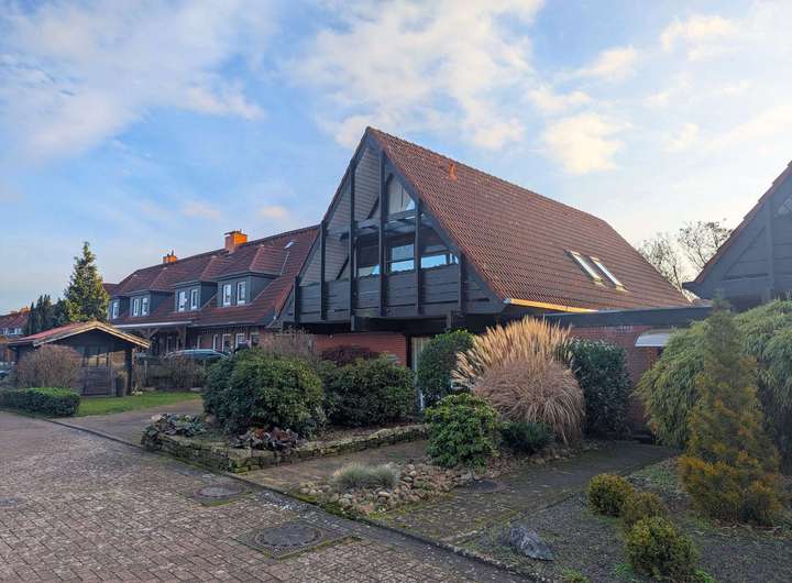 Das im Jahr 1982 errichtete Architektenhaus überzeugt durch seine außergewöhnliche Architektur. Die vollständig verglasten Giebelseiten prägen das Erscheinungsbild maßgeblich und schaffen ein beeindruckendes Raumgefühl über mehrere Ebenen hinweg. Auf einer Wohnfläche von ca. 170 m² bietet das Haus ein großzügiges und zugleich vielseitig nutzbares Raumkonzept, ergänzt durch eine separat zugängliche Einliegerwohnung. Das ca. 570 m² große Grundstück umfasst einen gepflegten Garten mit Gerätehaus sowie mehrere Terrassenbereiche, die unterschiedliche Rückzugs- und Aufenthaltsmöglichkeiten im Freien eröffnen. Ein Carport direkt vor der Hauseingangstür sorgt für komfortables und wettergeschütztes Parken. Das Erdgeschoss des Haupthauses bildet mit dem weitläufigen Wohnzimmer und direktem Terrassenzugang das Zentrum des Hauses. Große Fensterflächen verbinden den Innenraum harmonisch mit dem Garten und unterstreichen den offenen Charakter. Das angrenzende Esszimmer mit offener Küche fügt sich nahtlos in das Raumkonzept ein und bietet ideale Voraussetzungen für gemeinsames Wohnen und gesellige Anlässe. Ein Gäste-WC komplettiert diese Ebene. Die Ausstattung wird durch Parkett- und Fliesenböden abgerundet. Im Obergeschoss befinden sich die Schlafräume, die jeweils über eine eigene Loggia verfügen und damit private Außenbereiche bieten. Die Holzbrüstungen der Loggien sowie die außenliegenden Holzbalken betonen den architektonischen Anspruch des Hauses und verleihen ihm eine markante, individuelle Ausstrahlung. Die Einliegerwohnung ist über einen eigenen Zugang erreichbar und bietet mit zwei Zimmern, Küche, Duschbad und einer Terrasse zur rückwärtigen Gartenseite ein eigenständiges Wohnangebot. Sie eignet sich gleichermaßen für Familienangehörige, Gäste, Homeoffice-Lösungen oder zur Vermietung und erweitert die Nutzungsmöglichkeiten der Immobilie erheblich. Beheizt wird das Haus über eine Gasbrennwertheizung aus dem Jahr 2012. Die Immobilie ist Teil einer verkehrsberuhigten Wohnzone innerhalb eines architektonisch abgestimmten Ensembles mit gemeinschaftlich genutztem Kinderspielplatz, was den ruhigen und familienfreundlichen Charakter zusätzlich unterstreicht. Das Objekt befindet sich in einem renovierungsbedürftigen, jedoch insgesamt sehr soliden Zustand. Die Bausubstanz ist gepflegt und nicht verwohnt, entspricht jedoch in Teilen nicht mehr den heutigen Ausstattungs- und Designansprüchen. Die außenliegenden Holzbalken sowie die Holzbrüstungen der Loggien sollten aufgearbeitet werden, zudem ist der Austausch einzelner Velux-Dachfenster empfehlenswert. Insgesamt bietet sich hier eine hervorragende Gelegenheit, eine architektonisch besondere Immobilie durch gezielte Modernisierungsmaßnahmen in ein zeitgemäßes und individuelles Zuhause mit nachhaltigem Wertpotenzial zu verwandeln. Zur Wahrung der Privatsphäre der Eigentümer wurden Bilder mit KI bearbeitet.